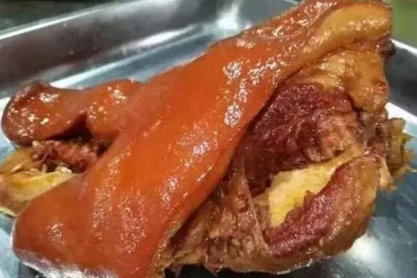 食材:豬肘一個,約5斤左右,鹽50克,生姜20克,料酒15克,蠔油20克,雞精15克,老湯5公斤,糖色水300克。