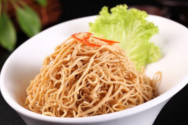 步驟一:首先將千張洗凈,然后將千張切成0.2厘米寬的細(xì)絲,接著將千張放入到熱水中煮5秒即可撈出。