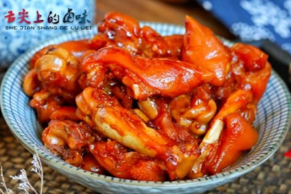 4、鍋內放入色拉油200克;燒至三成熱時放入干辣椒節、花椒小火煸炒至干辣椒節變為金黃色;放清水1千克調勻,出鍋備用。(5)另取不銹鋼桶內用竹墊子,放入豬蹄、糖色、蠔油、花雕酒、鹽、雞精、老抽、煮好的辣椒節和花椒、熬好的湯、生姜、大蔥蓋上蓋子大火燒開,改小火鹵1小時,離火即可。特點:口味香辣,肉質軟爛。