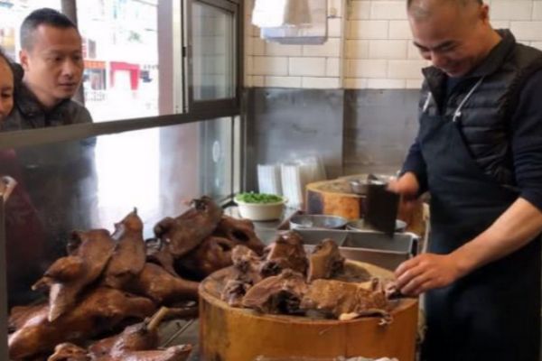 到了店門口,可以看到店里有好幾個人,一些是負責鹵鵝的,一些是負責切鵝肉打包的。但重點是在店里有很多只鹵制好的鵝,每一只看起來都非常大只。大到什么程度呢,就連大鍋都放不下。這家鹵鵝店開了有四十年之久,一只鹵鵝的價格不便宜,需要400元。