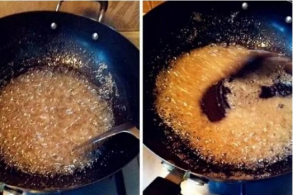 首先講講炒糖色的方法,很多人將炒糖色分成3種方法,水炒,油炒和混合炒。師傅認為,只要分水炒跟油炒就可以了。因為糖色炒好后,會根據需要加入開水來調制顏色和濃稠度。