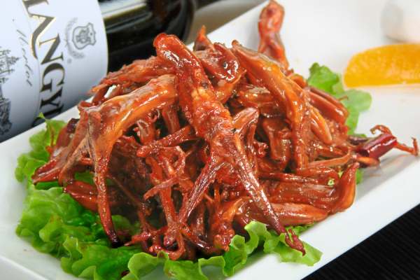 制作:將鴨舌泡入調料腌制2個小時,撈出將鴨舌風干,蒸熟即可。