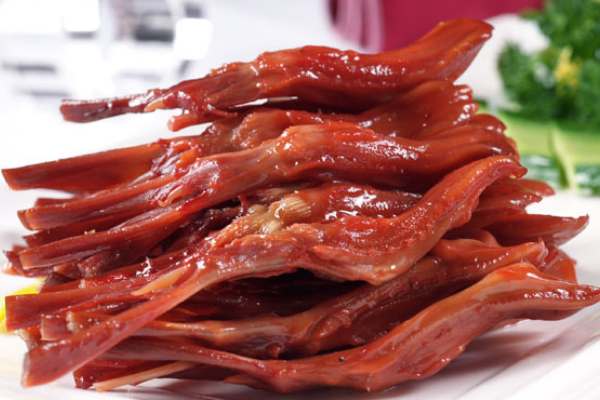 1、將新鮮的鴨舌清洗干凈,投入沸水中煮至八成熟,撈起沖涼,浸入蠔香汁中約6小時,撈起后放在通風的地方,風干水分。