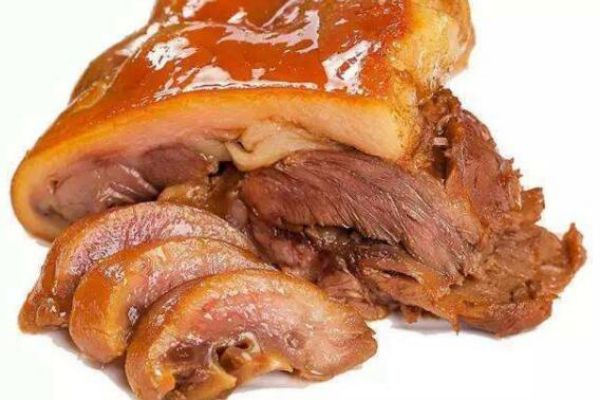 鹵豬頭肉配方一:精鹽30克、茴香7.5克、桂皮7.5克、醬油40克、甜面醬50克。豬頭肉約2500克泡入水中洗凈,鑷去細毛,割下雙耳,去掉豬眼圈、嘴唇、耳圈、鼻子、臉劈成兩塊,下巴劈成3塊,再放入水中浸泡,漂去血水。下水鍋煮半小時,撈出洗凈切成塊。取鍋上火放油,下甜面醬炒成甜醬色,加入鹵汁,放入肉塊、茴香、桂皮、醬油、精鹽及清水,先用旺火燒沸,再用炆火煮約3小時至肉酥爛即成。