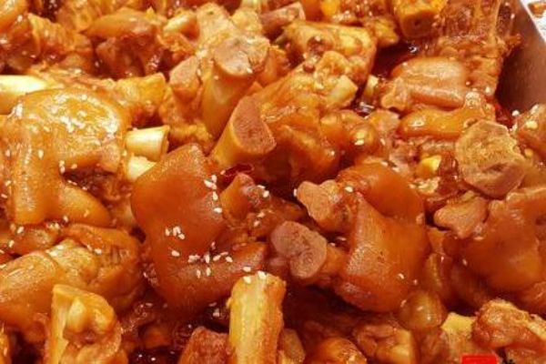 3、腌制:將豬蹄放入秘制鹵水中,加入各種香料和調(diào)味料,腌制一段時(shí)間,以便入味。