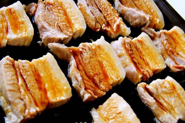 選用經過衛生檢驗符合要求的鮮豬五花肉,浸泡出血水,清洗干凈,切成長大約15厘米、寬8厘米、厚3厘米的的五花肉塊。