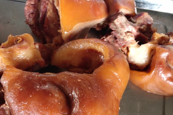 制作:豬頭肉洗凈拔光毛,用開水燙過。加些水煮開老鹵水,如果不咸就放點鹽,看自己的口味加。把鹵水配料放進老鹵水里,把豬頭肉放進去,鹵水滾了就轉小火慢慢煮,中途鹵水不夠深的話就加老抽。煮的時候,十分鐘用筷子把豬肉翻轉,讓各部位均勻受熱,才不會一邊深一邊淺,等到用筷子輕松插入豬肉里就表示熟了,等冷卻下來再切。