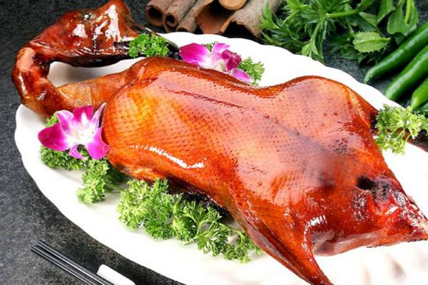 6 、將晾干的鵝掛入烤爐中,用果木木炭燒中火慢烤,烤至鵝肉熟透時,改用大火將鵝的表皮烤至酥脆,取出,先倒出鵝腹內的鹵汁,將鵝斬件裝盤,再淋上鹵汁,隨酸梅醬味碟上桌蘸食即可。
