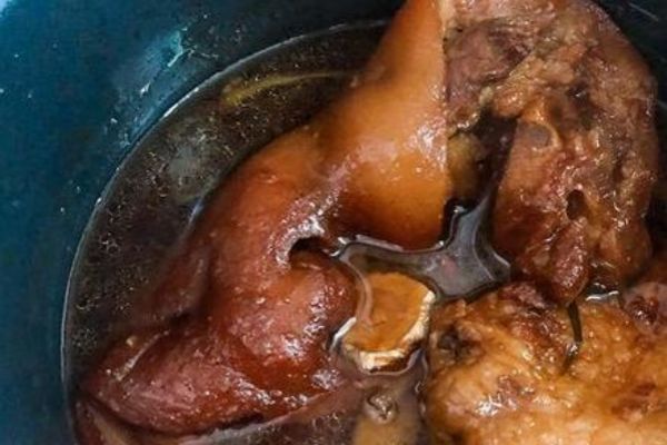 第三步,豬頭肉放入電飯鍋中,加適量蔥姜、八角和桂皮,再倒入適量料酒和生抽,然后倒入炒糖色,再倒入適量開水。蓋上蓋子,按下煮飯鍵,燜煮1個小時,1個小時后再燜30分鐘,就可以出鍋了。