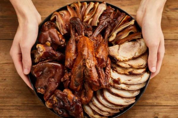 3.配湯(俗稱醬湯)。100kg水中放醬油5kg,使之呈不透明的深醬色,加蔥0.5kg,桂皮150g,小茴香(放在布袋內(nèi)),用旺火燒開,撈出香料(其中桂皮、小茴香可再利用一次),舀出待用。湯可長期使用,但用量須視湯的濃度而定,使用前須燒開并撇凈浮油。
