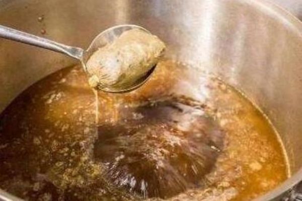 做潮州鹵水配料、調(diào)料準備好,還需用老母雞、棒子骨、排骨、醬油、桂圓肉 、肥豬肉等先熬煮高湯,再加鹵料包熬制。潮式鹵水講究濃香入味,再加點肥肉來煲湯底,鹵水湯底很有光澤。