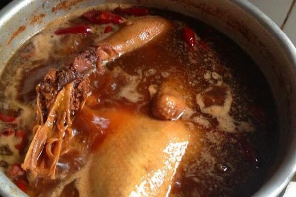 以8斤為例。將所需要鹵制的食材,經過完全清洗,焯一水之后,直接放入到鹵水中去鹵,全程開小火,食材在小火鹵制的過程中味道和顏色是逐漸進入的,所以先調入少量30毫升中壩醬油進去上色,隔15到20分鐘以后再去觀察是否還需要增加顏色。整個過程小火悶鹵即成。