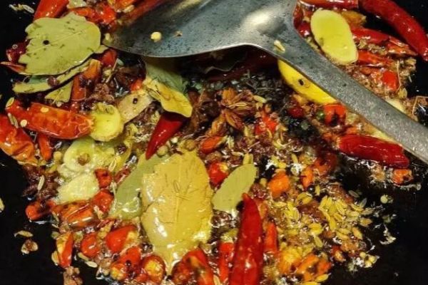 桂皮100g,白蔻50g,八角70g,香葉25g,羅漢果5個,草果50g,丁香15g,山柰20g,砂仁30g,小茴25g,陳皮15g,甘草20g,當(dāng)歸20g,白芷30g,香茅草15g,蓽菝30g,胡椒粉60g,干辣椒節(jié)30g,干紅花椒20g。香料用清水泡20分鐘氽水裝人紗布袋中。