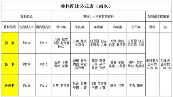 下面簡(jiǎn)單講解一下表格中的名詞。君料:主導(dǎo)鹵水香型的香料,用量最多,占香料總量的58%。臣料:輔助增香的香料,彌補(bǔ)和增加香味,用量占香料總量的29%。佐料(使料):起到輔助作用的香料,調(diào)和整體香料的口感,同時(shí)有增加藥香的作用,用量最少,只占香料總量的13%。