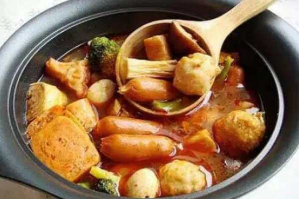麻辣燙底料150g、牛肉丸50g、包心魚丸50g、魚豆腐50g、面筋50g、腐竹50g、香菇50g、西蘭花50g、豆腐卷50g、火腿片50g、清水適量