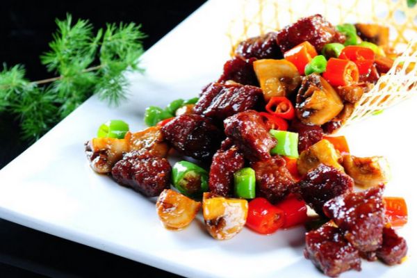 ④凈鍋置火上,放入植物油燒至六成熱,放人牛肉丁炸至表皮稍硬時,撈出磕散。
