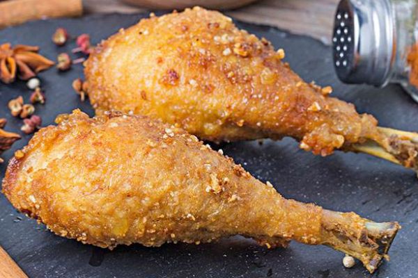 2、中間要記得翻動下,這樣顏色會更均勻,10分鐘時間到了,把雞腿撈出,然后等油溫升高再重油一次,重油油溫要高一點啊,6-7成油溫重油,炸不到1分鐘就可以撈出來了,出鍋之后可以根據自己口味加適量的孜然粉。
