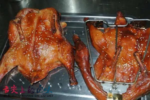 藥湯調制完畢后,我們把處理好的鴨子從桶內撈出來瀝干,然后將全部鴨子放進大桶內,將腌制好味道的藥湯全部倒進盛放鴨子的桶內,將蔥蒜姜壓在鴨子里面,用一兩塊木板,能放進鴨子的桶內為準,將木板放在鴨子上面,然后在木板上放一個桶,往桶里加水,水加到一定的程度就會發現藥湯慢慢上來了,鴨子全部浸沒到藥湯后就開始倒計時,夏天一般腌制10個小時就可以了,冬天需要腌制15個小時,其他季節腌制12個小時就可以,腌制的時間一定要保證,時間太短去腥入味不是很好,時間太長肉質會有影響。腌制12小時左右即可撈出了,鴨子腌制完畢撈出干萬不要放冰箱保鮮或者冷凍,否則鴨子會發粘,烤出來后口感不好,撈出后一定要及時放爐子上烤制。